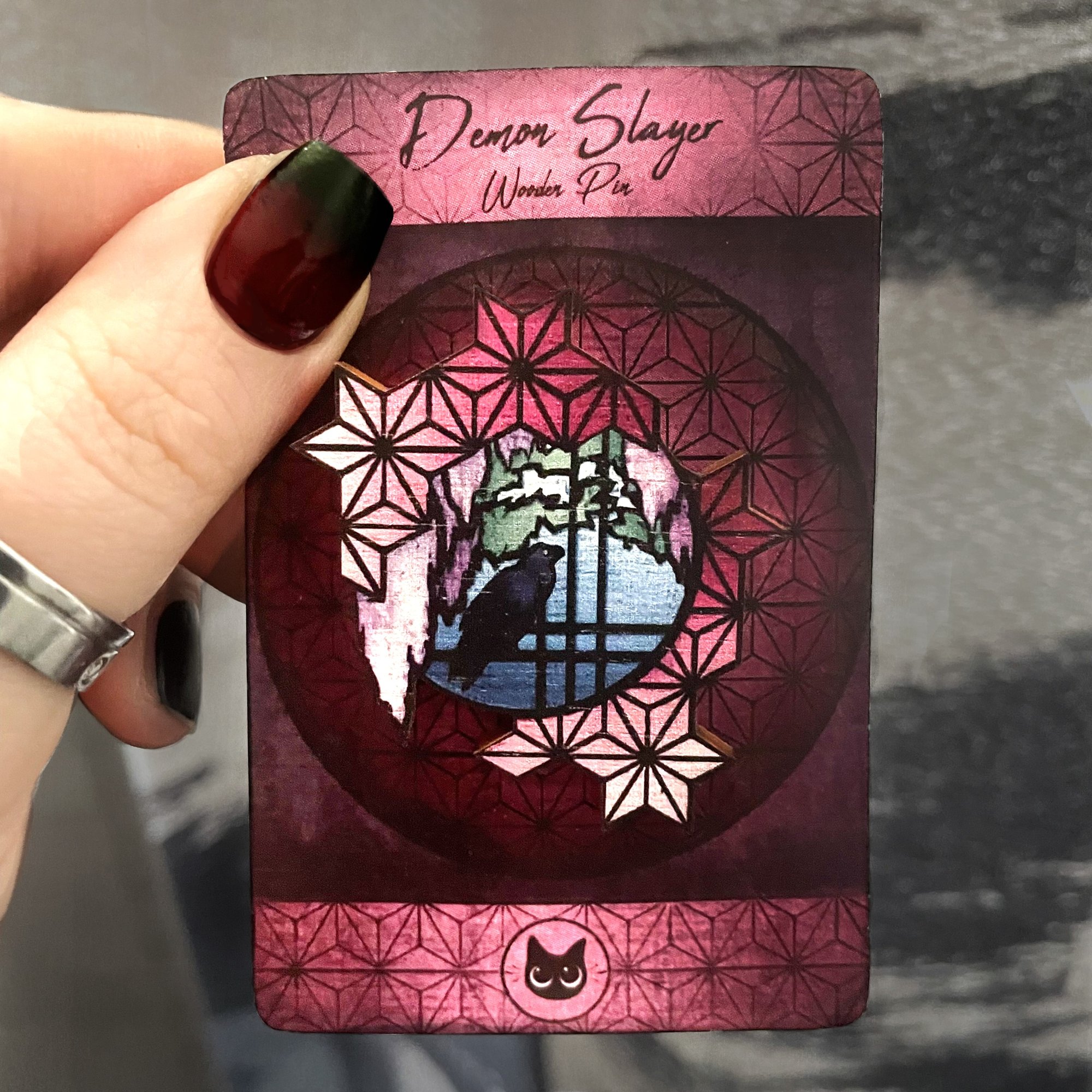 A wooden pin themed after the Demon Slayer series.
