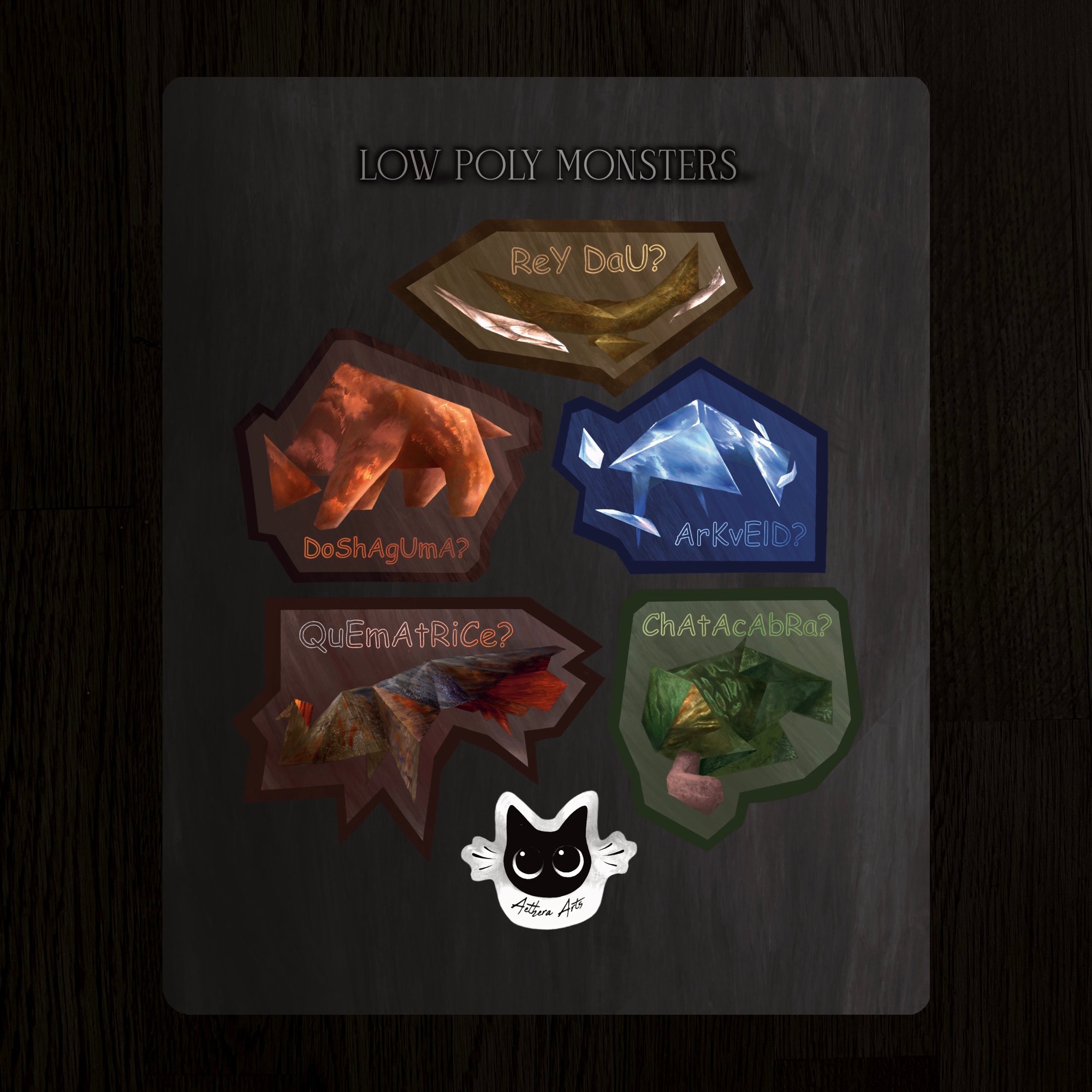 A matte sticker sheet featuring five low poly monsters (Rey Dau, Doshaguma, Arkveld, Quematrice, and Chatacabra).