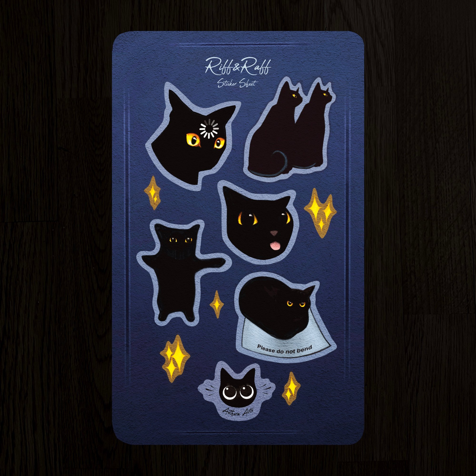 A matte sticker sheet featuring a collection of illustrations based on my two cats, Riff and Raff. :)